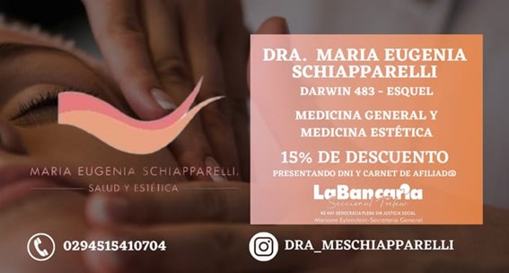 En la consulta de Maria Eugenia Schiapparelli, especializada en medicina general y estética, podés acceder a un 15% de descuento presentando tu DNI y carnet de afiliado. Un beneficio pensado para cuidar tu salud y bienestar con atención personalizada y profesionalismo.