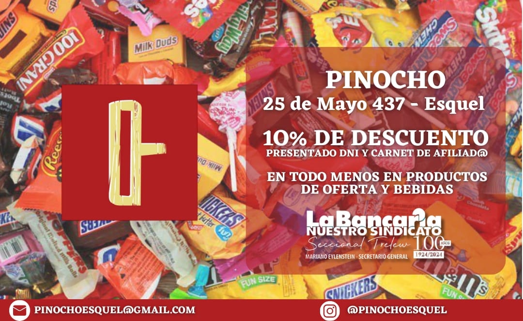 En Pinocho, tu local de confianza en Esquel, podés disfrutar de un 10% de descuento presentando tu DNI y carnet de afiliado. El descuento aplica en todos los productos, excepto en productos en oferta y bebidas.