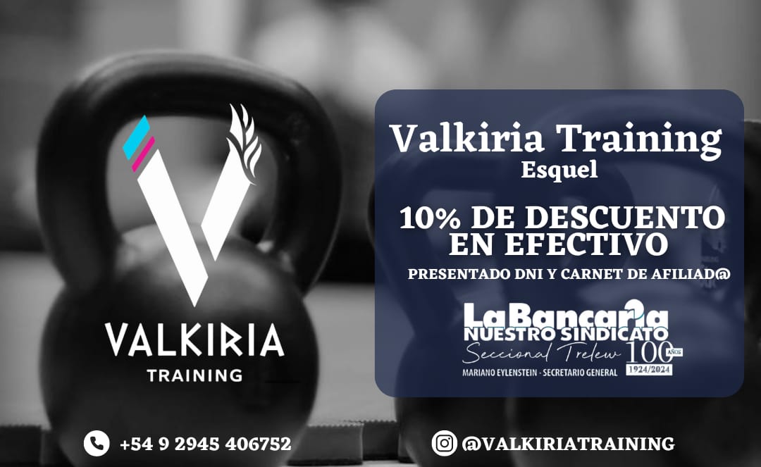 En Valkiria Training, tu espacio de entrenamiento en Esquel, accedé a un 10% de descuento abonando en efectivo, presentando tu DNI y carnet de afiliado.