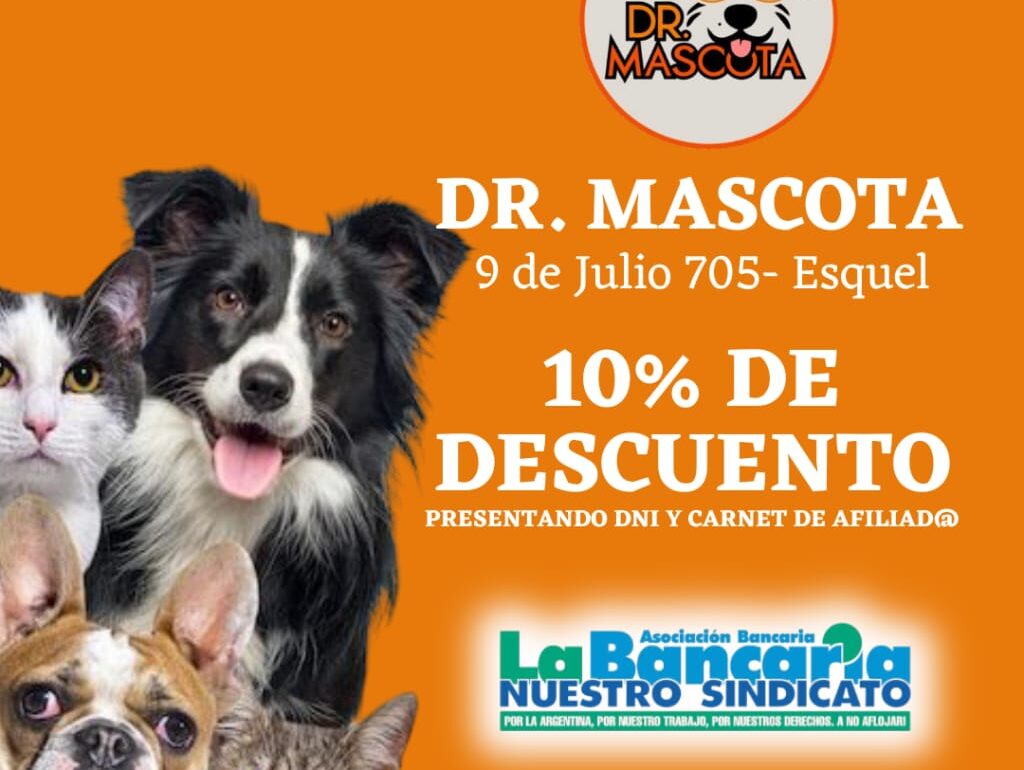 Cuidá la salud y bienestar de tus mascotas con este excelente convenio en Veterinaria Doctor Mascota, ubicada en Esquel. Presentando tu DNI y carnet de afiliado, accedés a un 10% de descuento en sus servicios y productos.