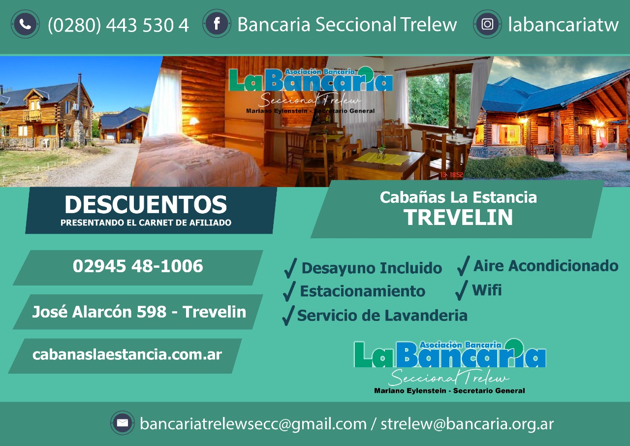 Los afiliados a La Bancaria acceden a descuentos especiales presentando su DNI y carnet de afiliado al momento de la reserva o check-in. Aprovechá esta oportunidad para disfrutar de Trevelin con beneficios exclusivos y la mejor relación calidad-precio.